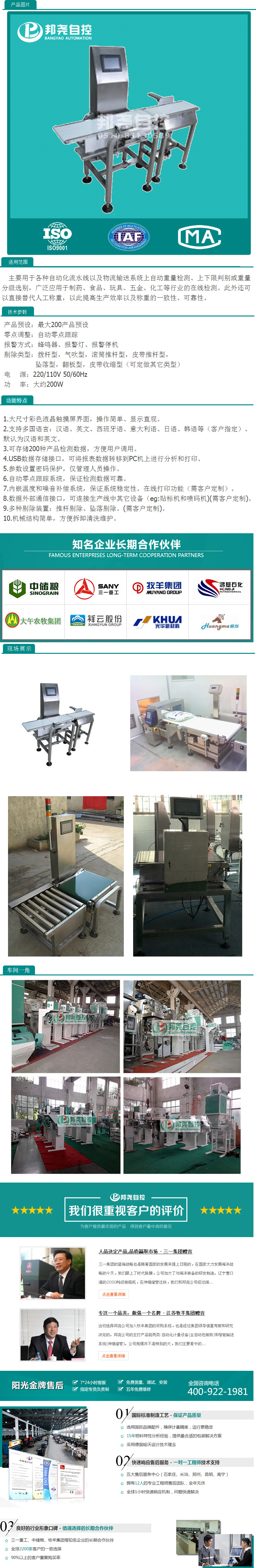 重量選別機又叫重量分選機,在線檢重秤,是一種應用于各種自動化流水線以及物流輸送系統上的自動重量檢測、上下限判別或根據重量檢測產品是否合格的高科技自動化分選設備。廣泛應用于制藥、食品、玩具、五金、化工、汽車配件等行業的在線檢測。此外,還可直接替代人工稱重,以達到提高生產效率,提高準確度和山少人工,降低成本的目的。